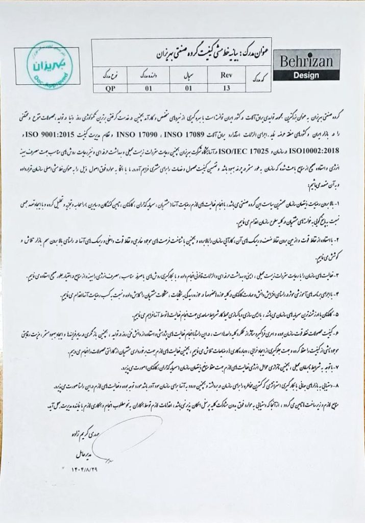 گروه صنعتی بهریزان، بعنوان یکی ازبزرگترین تولید کنندگان قفب و یراق آلات ساختمانی (دستگیره ، شیرآلات، سرویس بهداشتی و …) با برندهای بهریزان، ویتریس و بیلیا گروه صنعتی بهریزان با اعتقاد به تعالی سازمانی و استفاده از رویکردهای نوین مدیریتی شامل استاندارهای INSO 17090 ، INSO 17089، و بهرهگیری از توان علمی مدیران و متخصصین خود، در راستای ارتقاء کیفیت، استقرار استانداردهای بین المللی ISO 9001:2015 ،ISO10002:2018 ، ISO/IEC 17025 با اتکا به مبانی مدیریت نوین و در راستای چشم انداز و ماموریت این مجموعه جهت نیل به اهداف استراتژیک، موارد زیر را به عنوان خط مشی کیفیت خود تعیین را جهت پیادهسازی سیستم مدیریت کیفیت و بهبود مستمر فرآیندها و سیستم ها، با عنایت به همت و تلاش تمامی کارکنان توانمند و جوان سازمان در زیر ترسیم مینماید.
